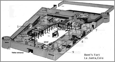 5) Blacksmith and Carpenter Shop As the principal outpost of American civilization on the southwestern frontier, Bent's Old Fort offered all kinds of accommodations to travelers. By 1846 the fort was a fairly self sufficient institution. Employing about 60 to 100 persons it required the services of numerous tradesmen such as wheelwrights, carpenters, coopers blacksmiths, and gunsmith. Lt. James Abert who stayed at the fort for several weeks in the summer of 1846, said "The ring of the blacksmith's hammer and the noise from the wagoner's shop were incessant." A black smith, carpenter, and related tradesmen worked in these areas throughout the fort's existence, a gunsmith operated here only briefly, during the later years.