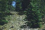 On the last day of June we picked up the trail at Vadito where it leaves the pavement and ascends a canyon to the west of U.S.Hill, thence to Taos. U.S.Hill was named for the spot where the army camped in January,1847 while headed for Taos during the rebellion. They had apparently followed the Camino Real along the wagon road which had served as a branch of the Santa Fe Trail and was in use as late as 1933 . (New Mexico,WPA 1940) We camped the first night at the top of the pass . Descending the next day, the view was almost the same as described nearly 150 years before.